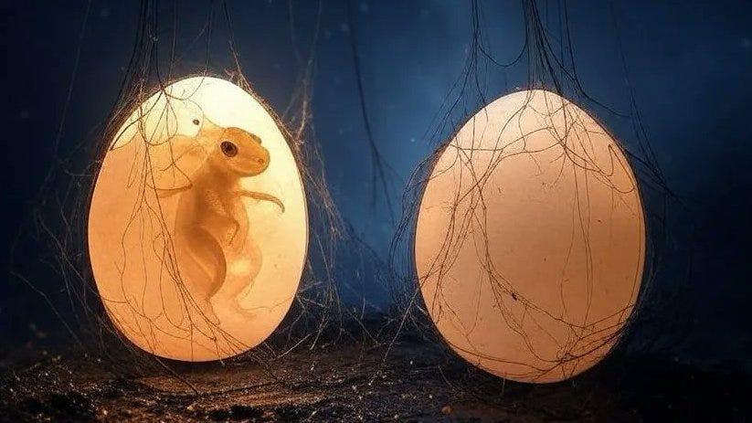 In the beginning, there was no earth, sky, sun, or moon; only a vast and impenetrable darkness filled the void. This darkness, alive and pulsating, carried within it the seeds of creation. Sparks of light, like fleeting lightning, pierced the darkness, and from their meeting arose two luminous eggs. These eggs, suspended in a web woven from the strands of the Darkness itself, began to grow and pulse with life. When they hatched, Mukat and Tamaioit emerged, fully formed, their first breaths echoing in the void.