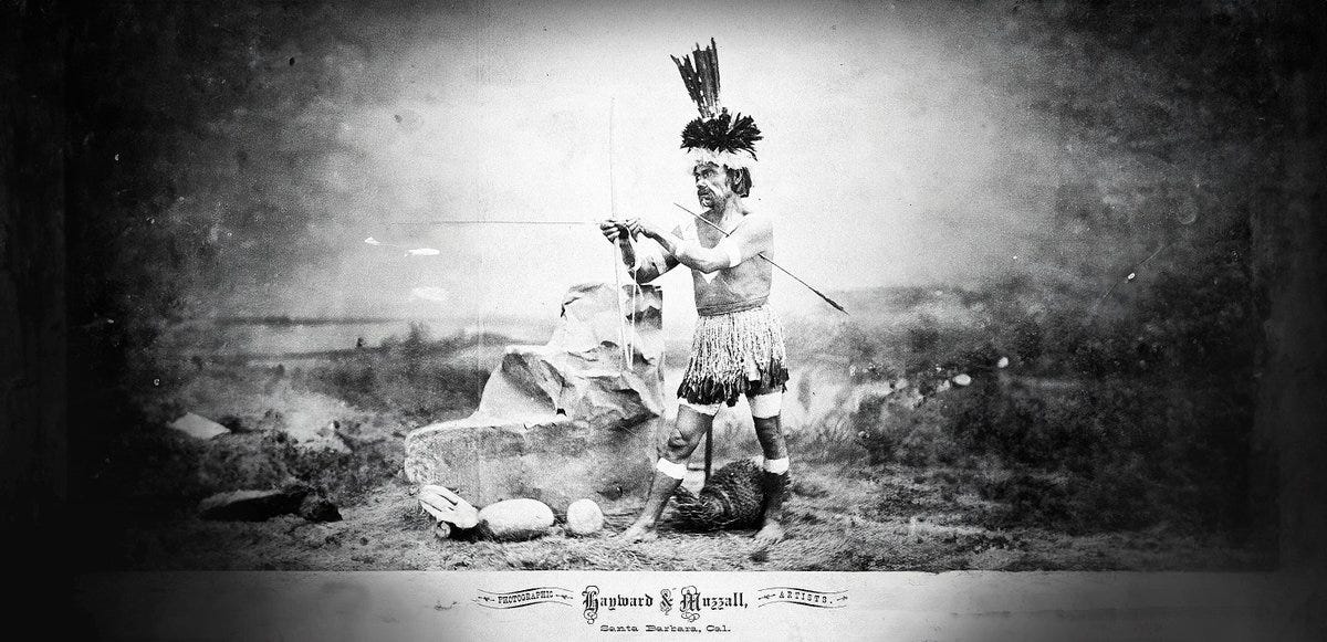 There was a strategy in these wars. Thomas Blackburn’s research into Chumash mythology suggests that smoke signals may have been used for communication, a tactical element that speaks to a level of organization beyond mere chance encounters. Battles, in some cases, were even prearranged. However, Chumash warfare was often shaped by opportunity—surprise attacks, retaliatory strikes, and swift movements rather than prolonged campaigns. The bow and arrow were the weapon of choice, and their presence was documented in both Spanish accounts and visual records, such as the ceremonial attire of Rafael Solares. The gruesome fate of soldier Gabriel Espinosa, who was left “pierced like a sieve with arrows” (p. 91), is just one of many reminders that Chumash warriors were neither unarmed nor unskilled.